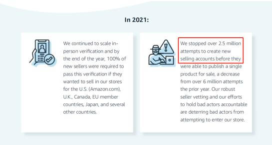 在报告里面,亚马逊把阻止上百万虚假账户的功劳,归功于自己的新开店审核措施。在2021年,亚马逊实施了开店视频验证,要求卖家开店时需要和官方审核人员,进行一对一视频通话以验证其身份,从而使潜在的风险卖家更难注册销售账户。