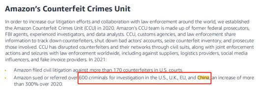 最关键的一点是,这份报告首次官方承认了一件事,那就是和中国部门联合执法,把销售假冒山寨产品的卖家送进去这件事。