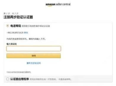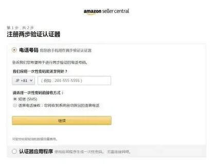 1.选择电话号码方式后,输入用于两步验证的电话号码,并通过短信或者语音电话的方式进行验证。记得继续前要把电话前的国家改成自己所在的国家或地区(中国大陆卖家选择“中国+86”)。