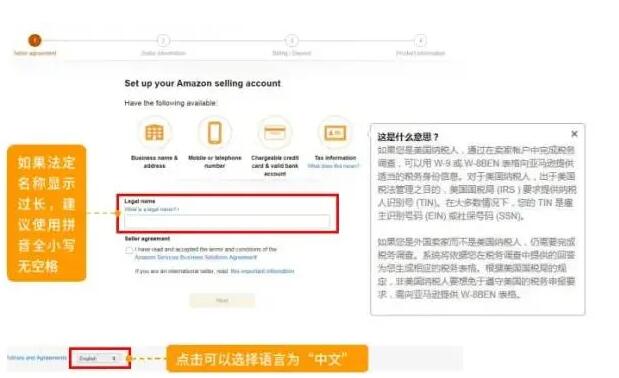 在画面中用拼音填写公司法定名称(也就是公司执照上公司名字的拼音),然后勾选卖家协议,点击“Next”。