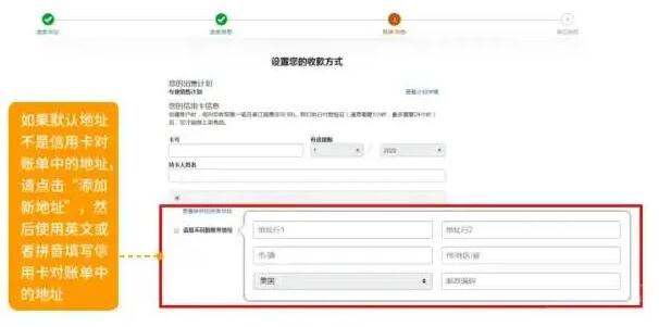 2.检查默认地址信息是否与信用卡账单地址相同。如不同,请点击“添加新地址”,然后使用英文或者拼音填写新的地址信息。注意:如果填写的信用卡账单地址与您在银行填写的账单寄送地址不一致,可能会导致账户注册失败;