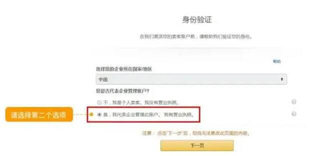 企业账户类型用于区分个人卖家和企业卖家。通过账户运营经理开店的卖家请选择第二个选项“是,我代表企业管理此账户。我有营业执照。”